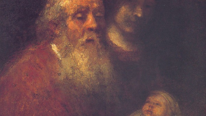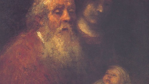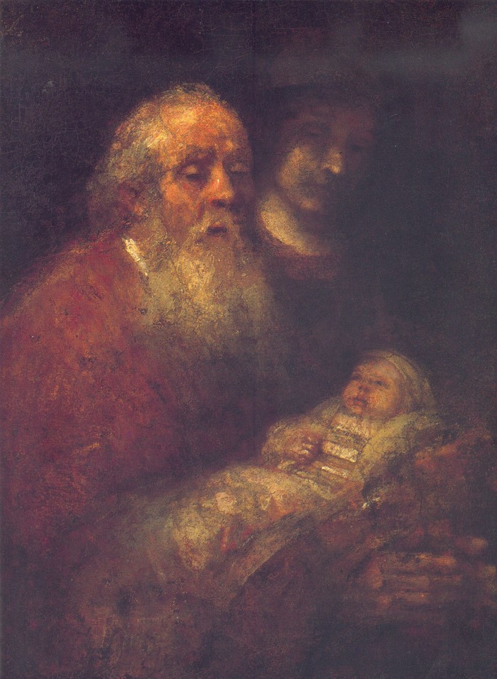 Lige fra sine yngste år var Rembrandt optaget af motivet med den gamle Simeon og barnet Jesus. Gang på gang fremstillede han oldingen og den lille baby i sine malerier og gravurer. Undertiden vender den fornemme Simeon ryggen til os, så vi kan beundre hans pragtfulde dragt, undertiden er han klædt som ypperstepræst, og undertiden lægger Rembrandt mere vægt på optrinnet med forældrene, der bærer deres barn ind i templet for første gang og her møder en gammel mand og en gammel kvinde - kun en lille episode i et stort og myldrende sceneri, på baggrund af en trappe, som fromme mennesker kryber op ad på knæene for at gøre sig fortjent til frelsen. – Helt som fromme katolikker til alle tider gør det ad Scala Santa i Rom.